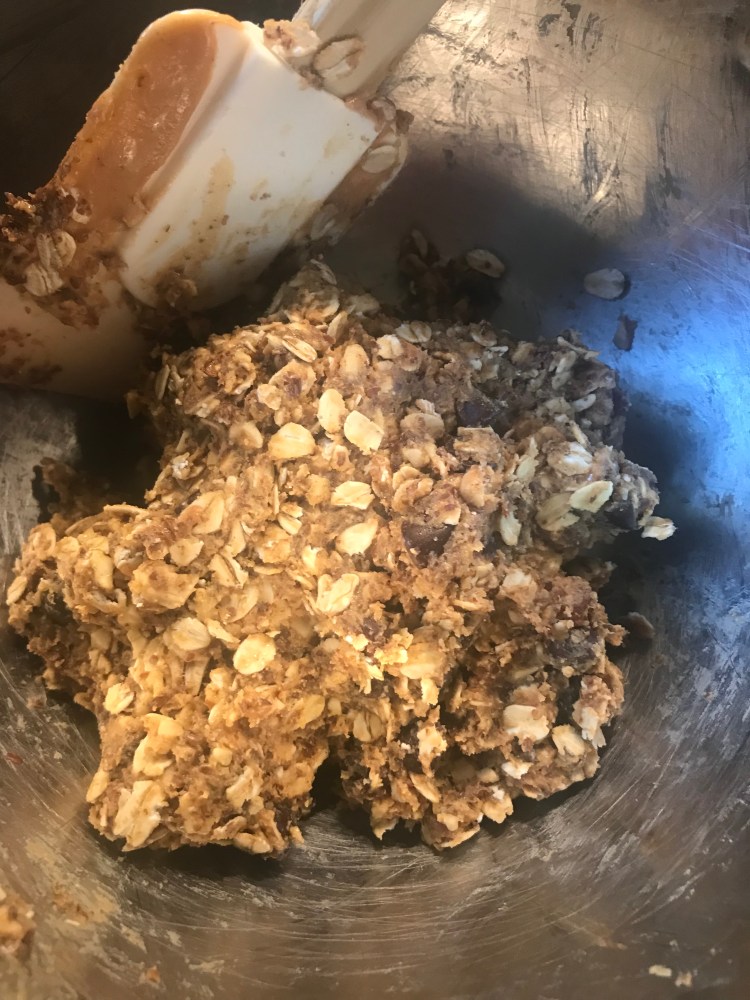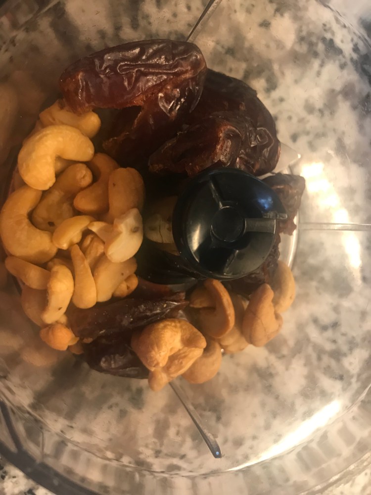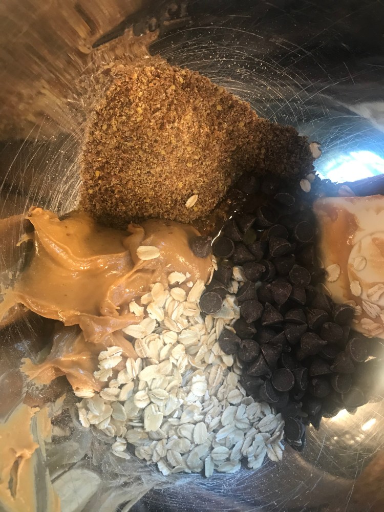 Throw your oats, peanut butter, ground flax, chocolate chips, dried fruit and honey (yeast too if you need it!) in a bowl. Grab a food processor and mix your nuts and dates. Mostly just the dates but the nuts (or you could use oats) keeps it form becoming a huge blob.