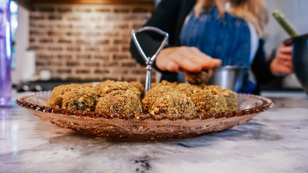 I like to use a gelato scoop to scrape mine out and ball up evenly. Then roll them in your reserved pistachio crumbles.