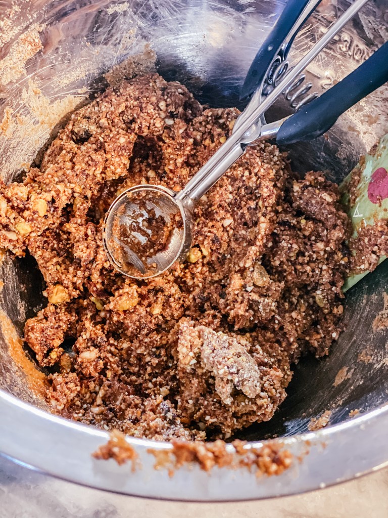 I like to chop my nuts in a food processor first. Pistachios first so you can save half. Next, almonds then start adding in the dates, dried cherries and the rest of your ingredients.